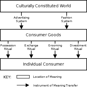 The idea of goods as carriers of meaning is a fairly well established idea according to McCracken. However, McCracken also states that meaning flows and is in permanent transit – this is what gives goods their communicative power (McCracken 1988:71). In fact, his model of consumption, is actually a model of the movement and manufacture of meaning. With this model, he equals consumption with culture – they are mutually dependent entities. The significance of goods is not only that they have meaning, but that they transfer meaning. Goods play an integral part in the flow of meaning between the “culturally constituted world” and the consumer.