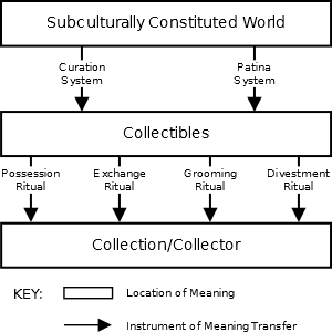 This is what McCracken uses to ground his statement of meaning as something originally located in the culturally constituted world. Now, with this theoretical core established, we go on to consider what actually constitutes collection. I have stated that I believe collection to be a specific form of consumption, so a good place to start is to attempt to define these specifics. While being a “sub-category”, so to speak, of consumption, there is still a border between “mere” consumption and collection.
